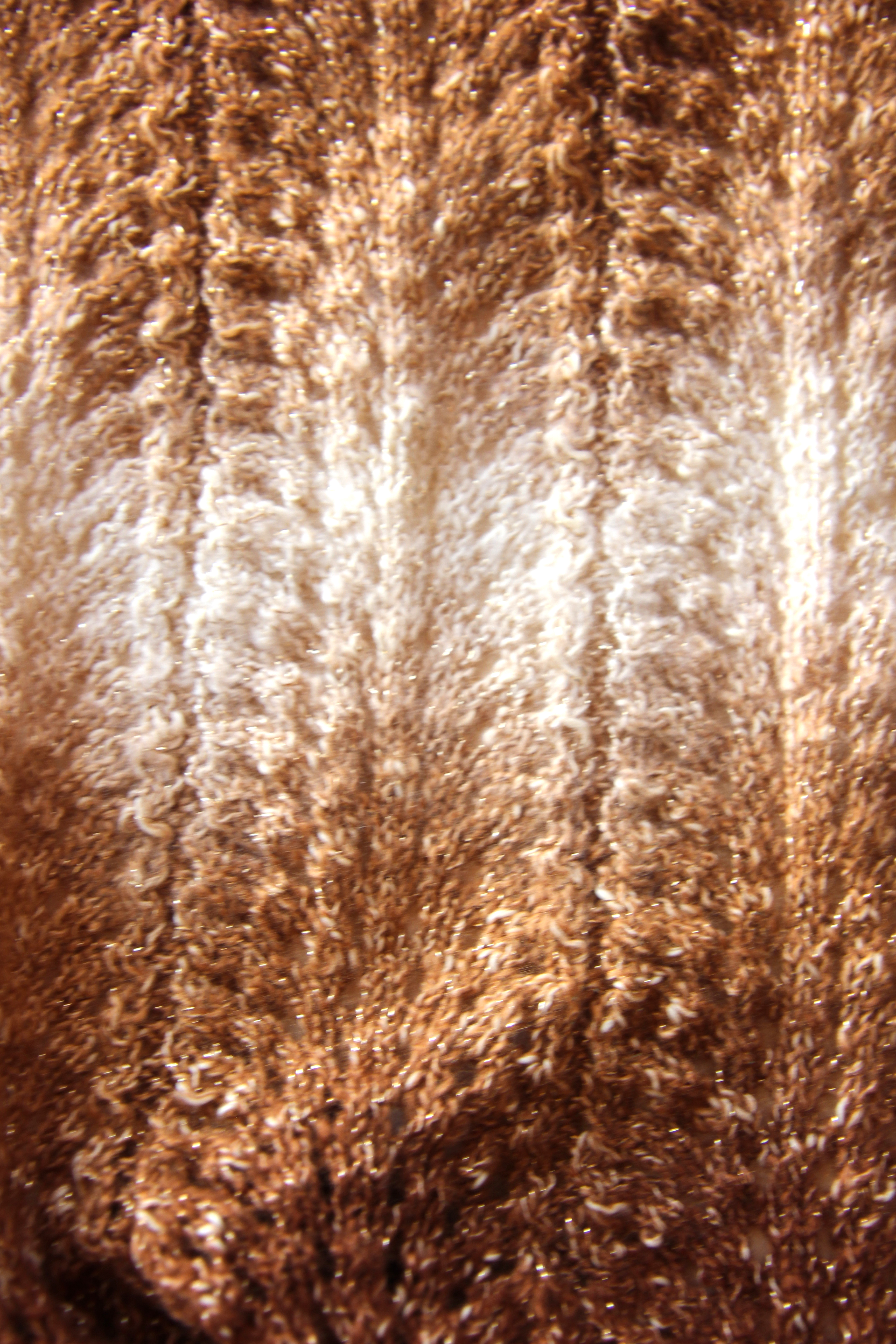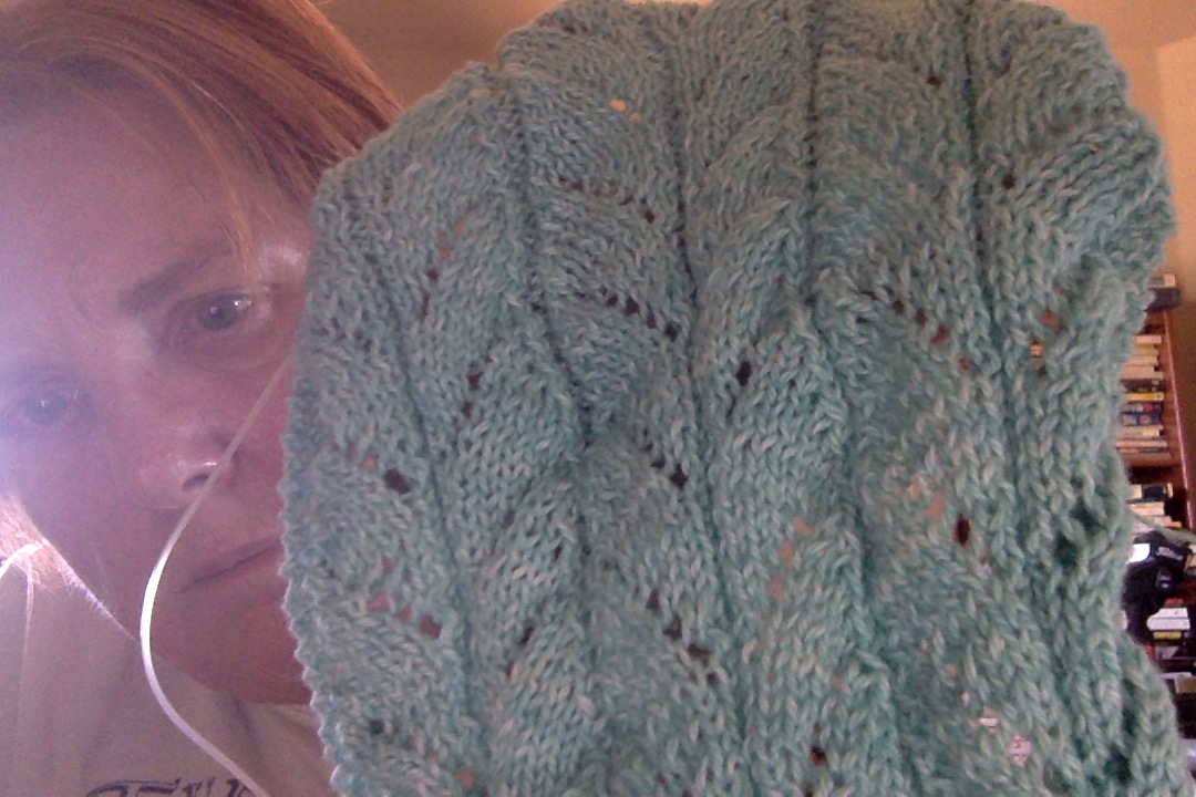 I finished another scarf. I can’t stand long enough to block it or photograph it. On this one, I played around a bit. I had worked out the lace pattern for the blue scarf, and the lace pattern on this scarf is based on the blue scarf. I kicked it up a notch.