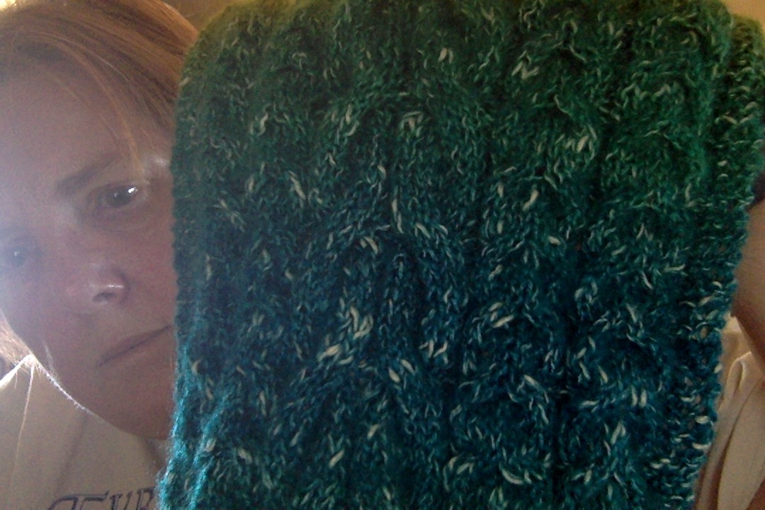 I need to photograph a scarf I knitted so I can put the scarf in my on-line store. But I can’t get the white board out of the closet and get it over to the sliding glass door and I can’t stand up while I focus the camera. This is the best I can do…and it’s not very good.