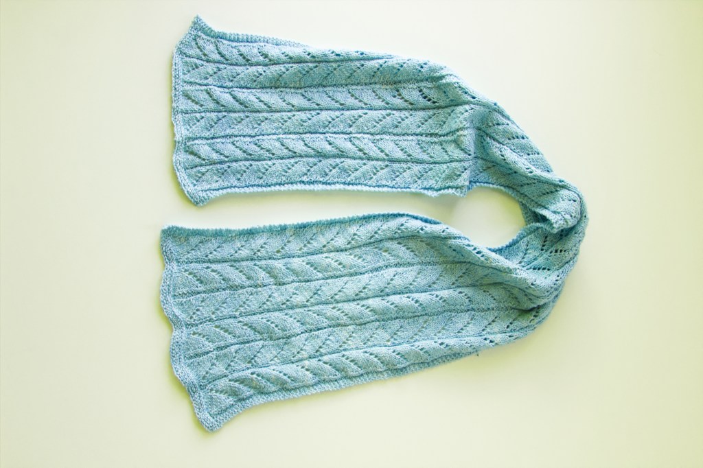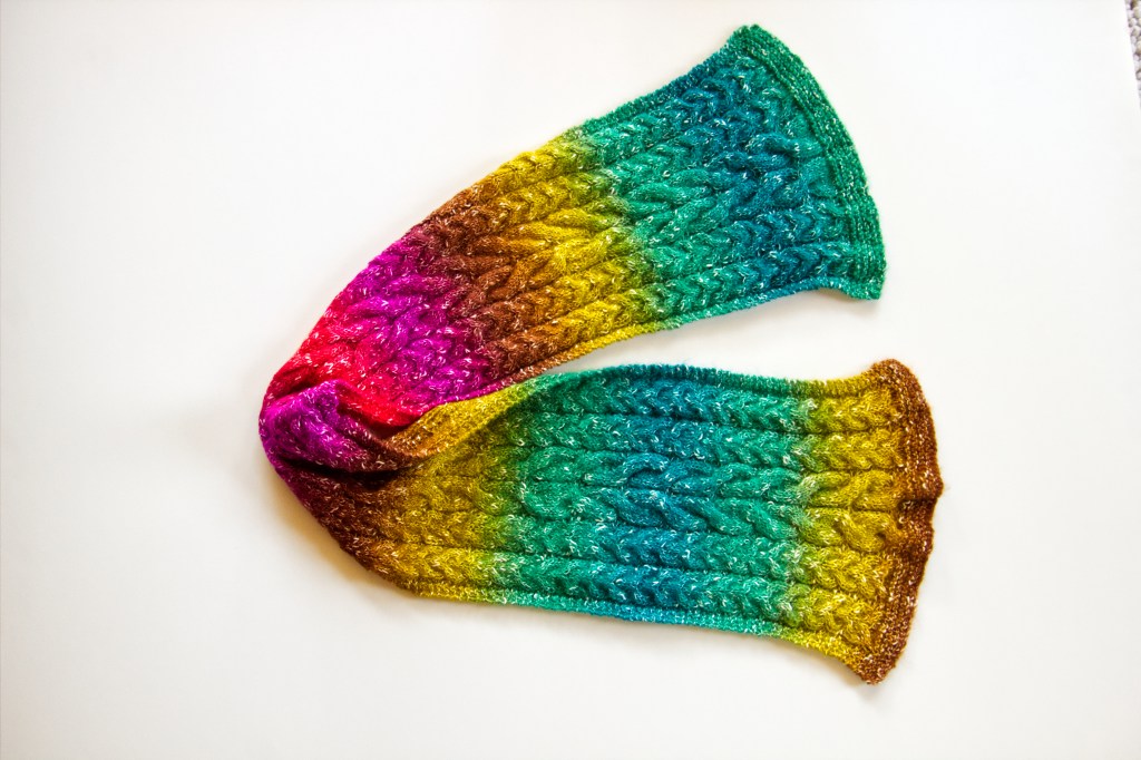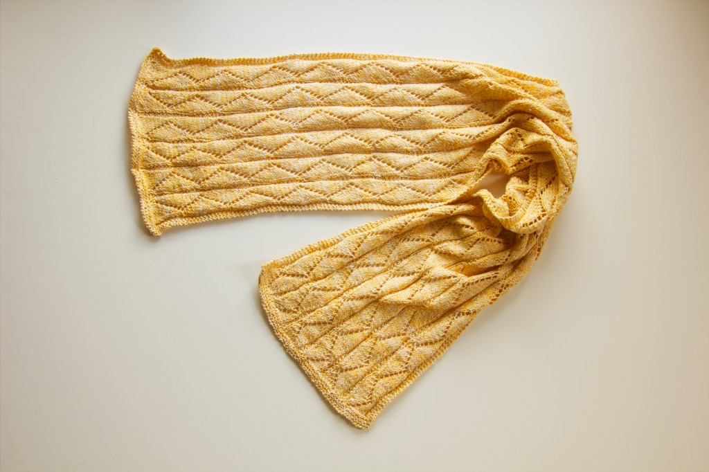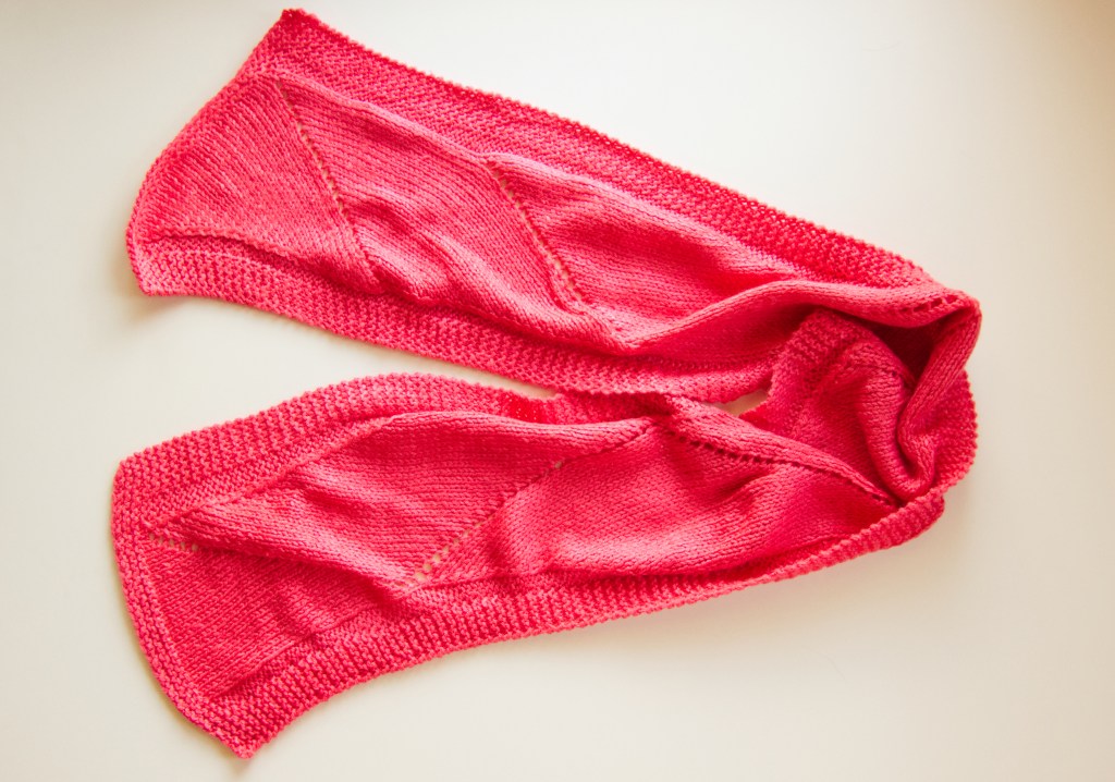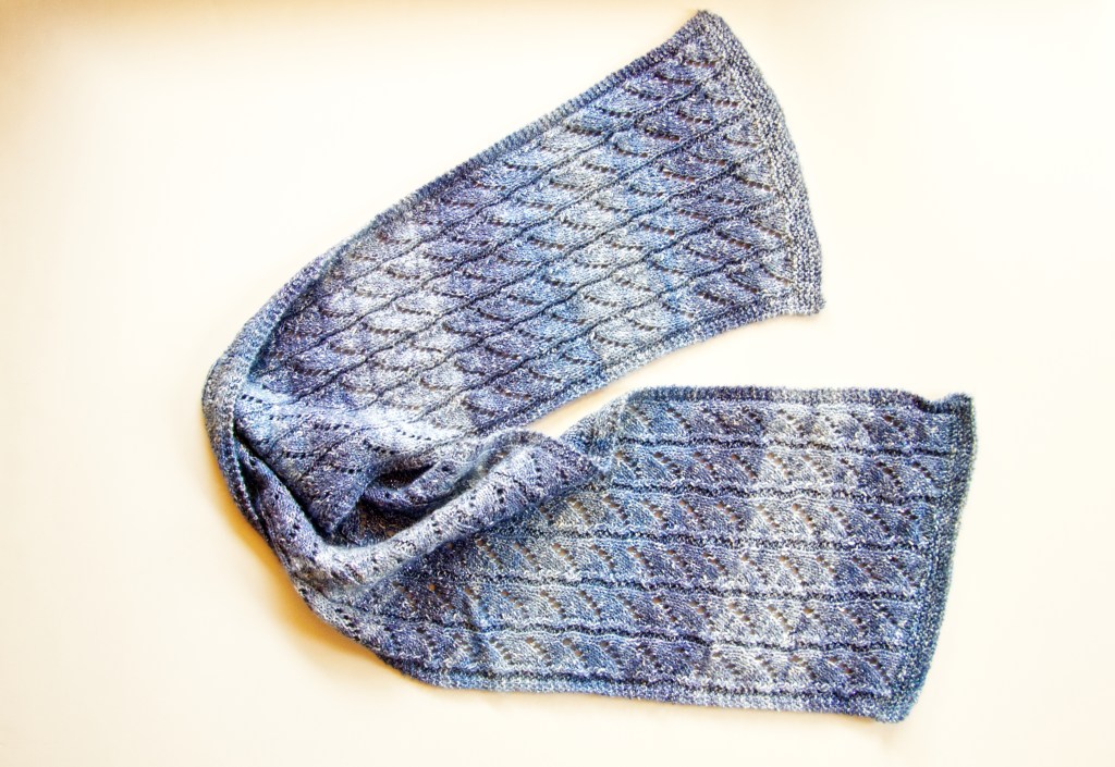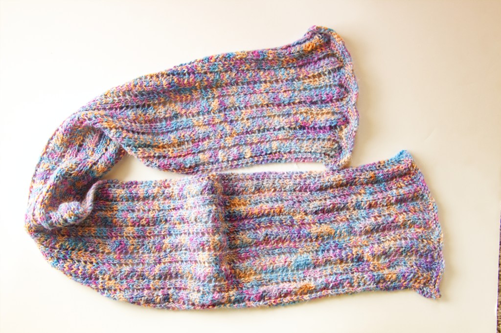 I need to get more scarves into my store. The scarves were finished, they just needed to be photographed and listed. I’ve got some hand dyed pieces. I knit up a blank using white cotton. Then I dye the piece. Next, I unravel the yarn and knit up the final piece. The dye doesn’t take evenly on a knitted blank, so the result is a marled color.