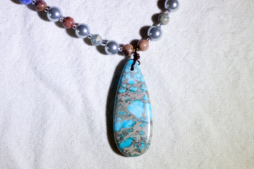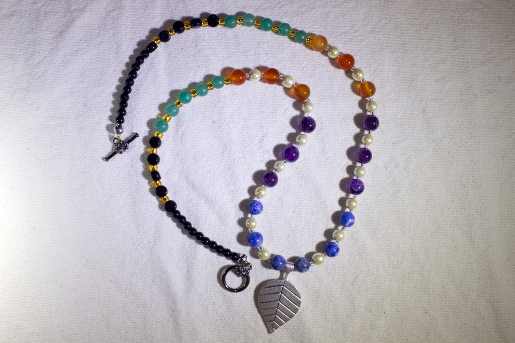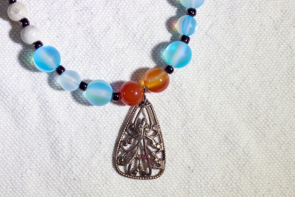 I started working on jewelry and I like what I came up with. I don’t like how I photographed the pieces. Natural light wasn’t enough light. I added two LED lights, one on each side. That made for nasty shadows. So I kept the LED lights and added on camera flash. I’m not wild about the results although I did get the colors accurate.