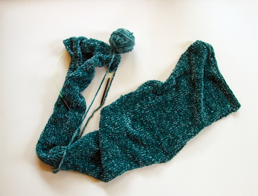 I’ve bought a type of yarn I have never bought before and I’m making silky, chenille scarves. I like how this yarn feels. Depending on how well these two sell once I get them into my store, I may be working with more chenille yarn.