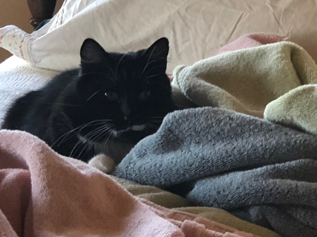 Usually the cats hide when they think I’m going to photograph them. I had to sneak up on Tinker, zoom the cellphone camera as much as possible, and hope for the best. The shot is backlit and I could have overcome that with the Canon. The cellphone doesn’t allow for that kind of tinkering. The cats don’t allow for me to take the time to use the Canon.