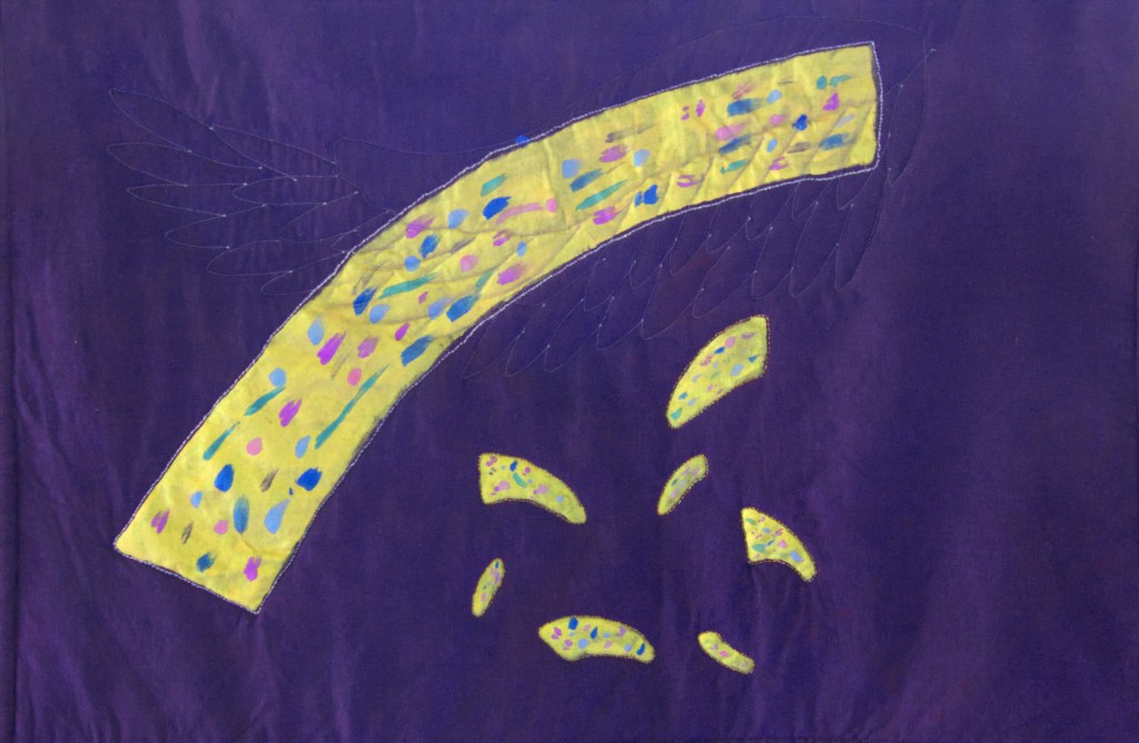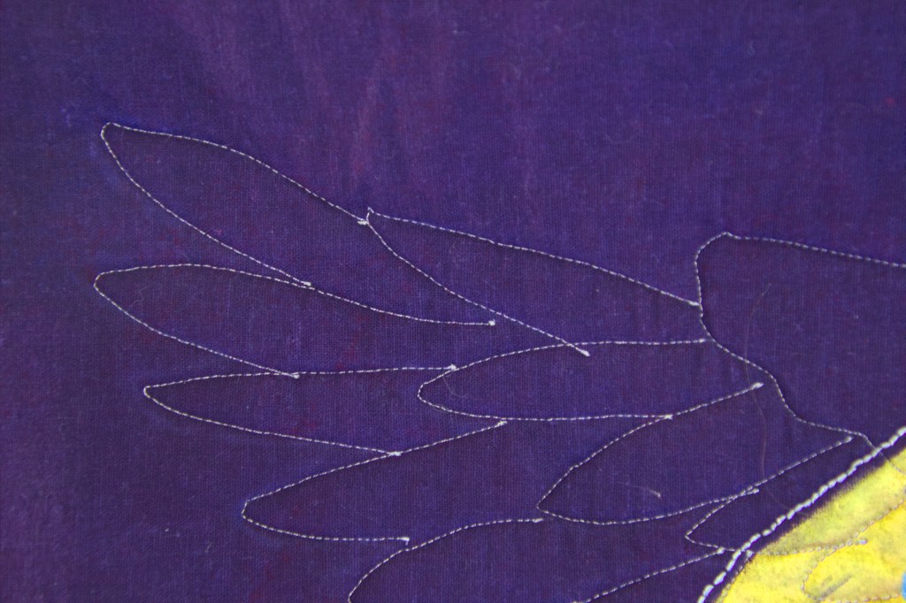 A year ago on this date, someone I knew and cared for committed suicide by shooting himself. Above, is the quilt I made to help heal my grief. It’s called Beneath The Wings Of The Devine. I quilted an eagle wing on top of the arc of his life.