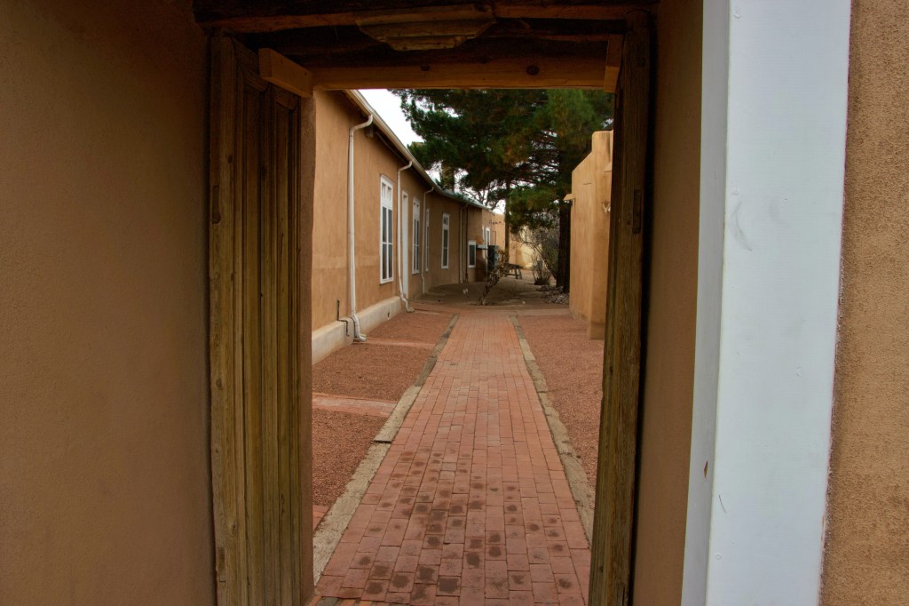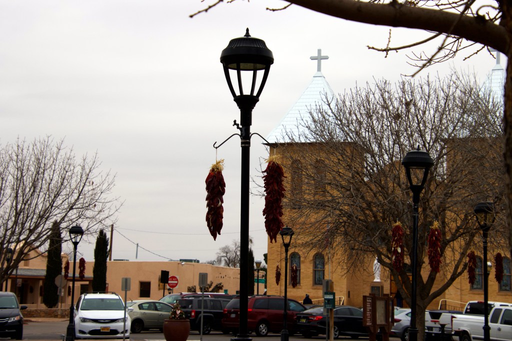 I didn’t like this next shot until I realized it shows everything that can go wrong with historic preservation. Overhead power lines. Parking where parking shouldn’t be because it’s impossible to park on the narrow streets. The streets can’t be made any wider because the buildings are so close to the street a sidewalk barely fits between the building and the street. The church has a parking lot, but the entrance to the lot has a chain across it keeping cars out. I still don’t like the shot, but now I don’t like it because it’s an accurate depiction of Mesilla. No place left for Billy the Kid to park his horse.