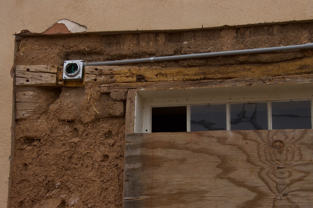 In the photos below, you can see the original wood beam over the window, original adobe, and the challenge of getting wiring into a building that was never intended to have wiring.