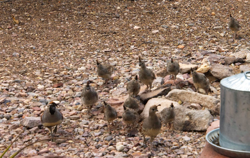 Quail photos have to be done through the sliding glass door. Any movement or noise, and the quail scatter. Every year, we look forward to seeing thumbs. Baby quail look like thumbs with feet. The thumbs are now nearly adults although still accompanied by adults when they visit the yard. There may be a second batch of thumbs this year.