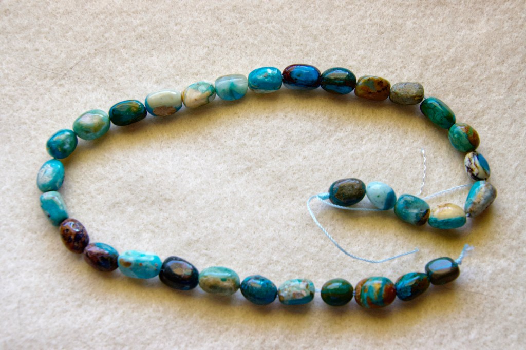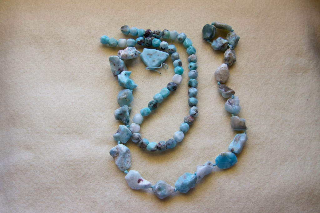Larimar which is found only in the Dominican Republic. I love the stone, but at the moment, the beads are pricy. Gem prices are driven by scarcity, politics, and how much is being mined at the moment.