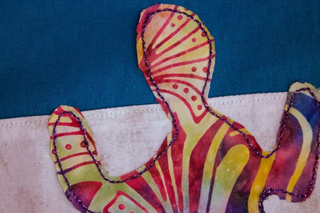 I’ve taken three classes from one biology teacher, and I’ve had to make quilts for each class. It wasn’t an assignment; it was art that insisted on being made. This semester, I’m taking human physiology. I’ve worked out what I want on this quilt, and worked out what the different things will look like. The quilt will have trans-membrane proteins, G-coupled protein receptors, transport proteins, neurotransmitters and neurotransmitter receptors, hemoglobin molecule, chlorophyll molecule, cell-to-cell communication, and if I can get enough detail into a small space, a protein receptor on the surface of the cell membrane.