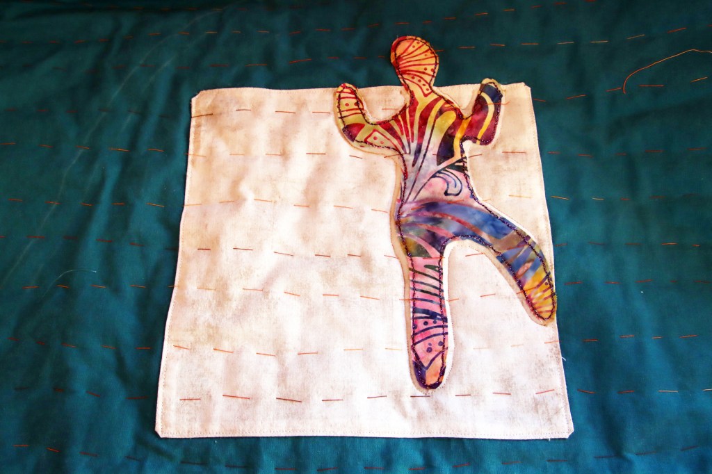 I’ve pretty much figured out how I want to quilt the figure. I’ve outlined the figure inside the box, but not outside the box. I haven’t decided how or if I want to quilt the rest of the box. I’ll make that decision after I get the rest of the piece quilted. I also haven’t decided if I want to quilt around the outside of the part of the figure that’s outside the box.