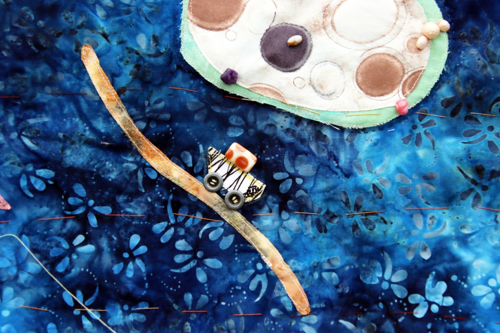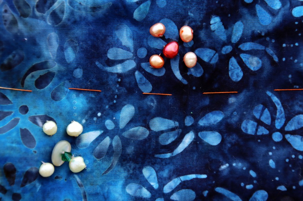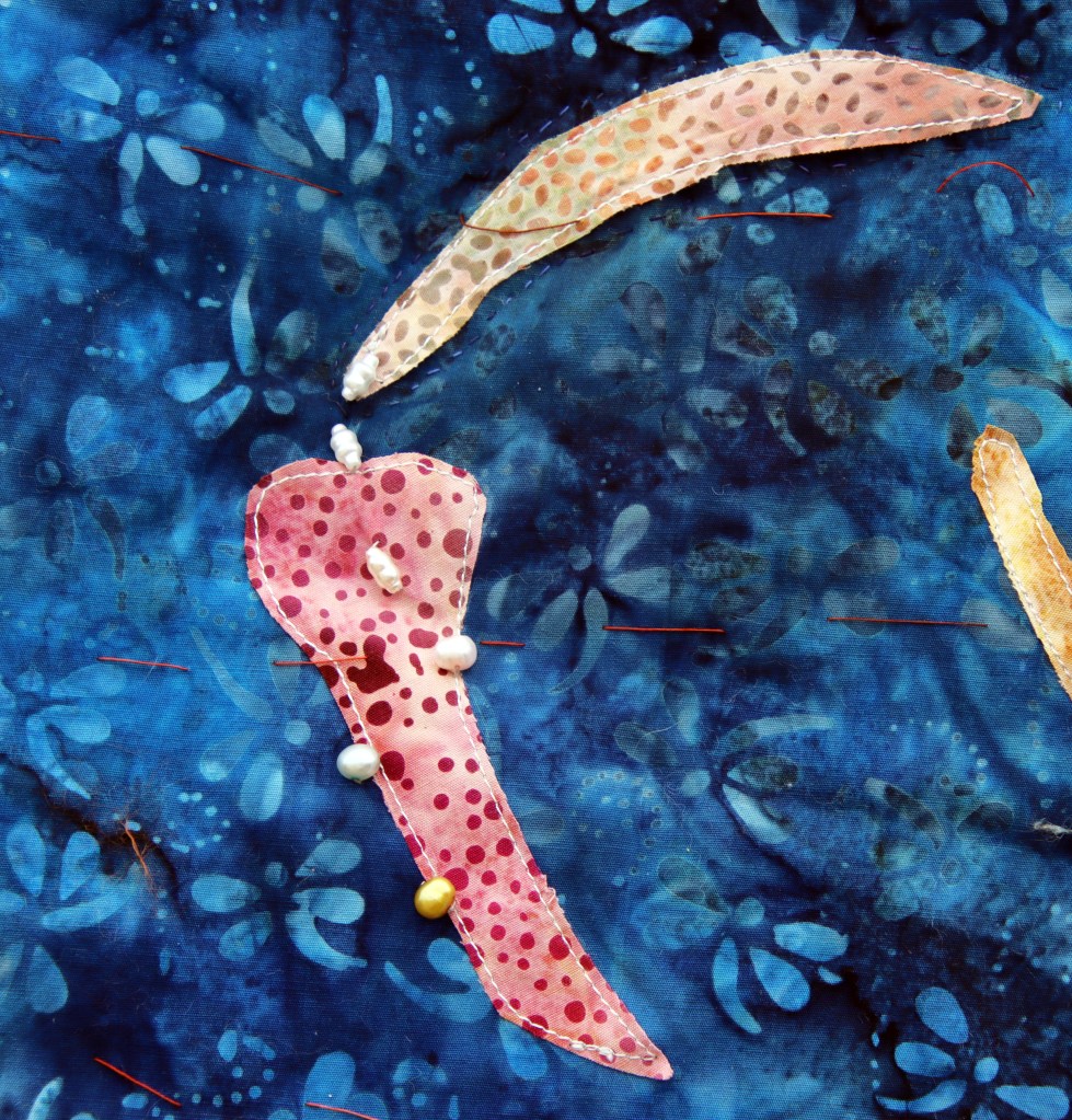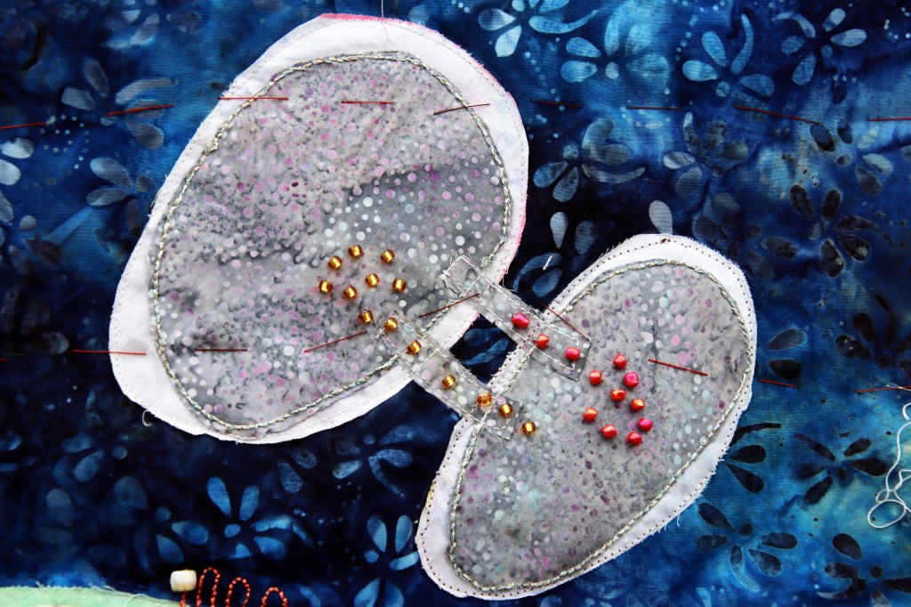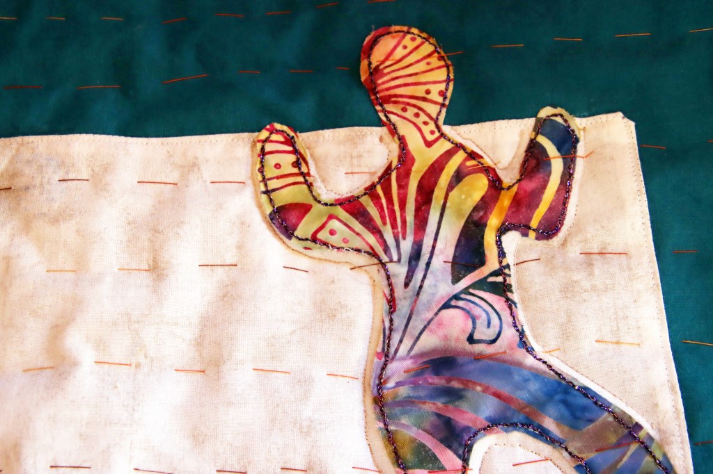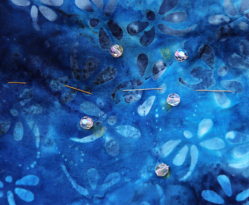 I haven’t finished quilting the piece, so there are orange basting threads holding the top, batting and backing together. I’m quilting by hand because I added the beads before making the quilt sandwich. Had I not done that, I could have done the quilting by machine. I have cataracts that can’t be removed because there’s a 25% risk of the retina in my right eye detaching. The cataracts mess with my vision, and I’m having difficulty seeing close up.