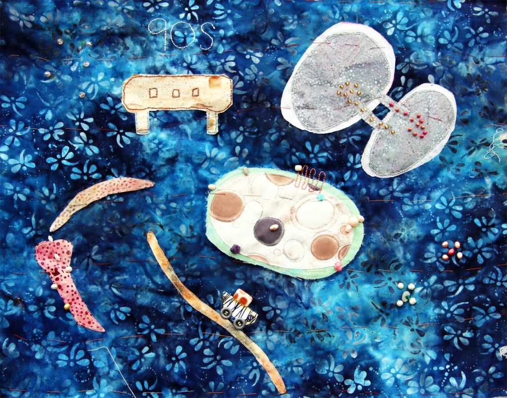 This semester, I learned there’s a structural overlap between plants and animals. The appliqués represent cell-to-cell communications in animals. Some cells are attached. Plant cells have the same structure. This amazed me. The beads represent simple diffusion.