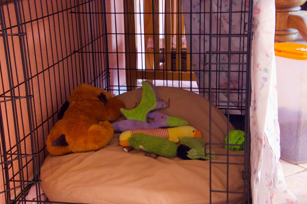 Brady likes to hide out in the pet carrier in the kitchen. I think it’s because it’s dark inside the carrier and she feels safe in her den. She’s not fond of the crate we have for her. I decided to make the crate more den like. I took a sheet, crudely attached the sheet to the crate, and created a darkened den. I put Brady’s toys in her new den. She refuses to go inside the den.
