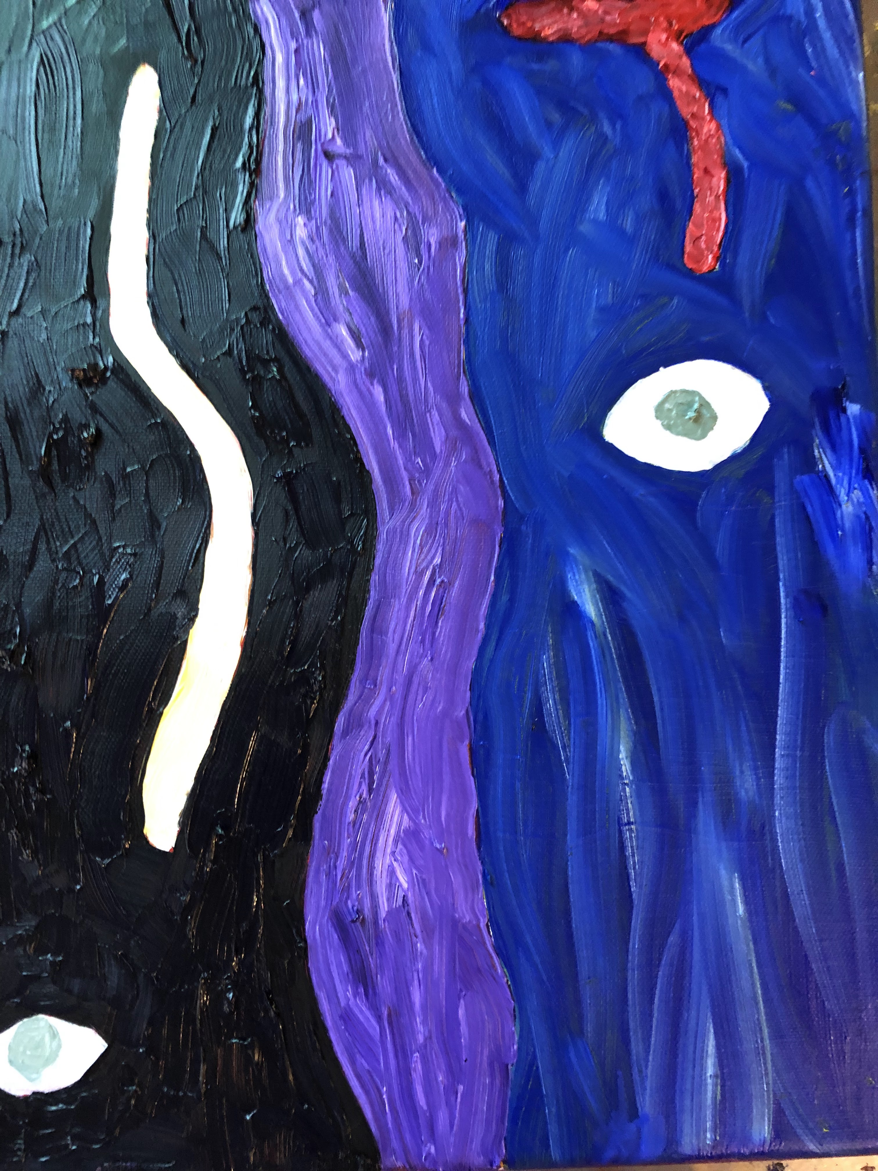 I detested the optical illusion portrait, so I killed it and tried to show how a depressive episode feels. When I planned the two abstract portraits, I thought about paintings I had seen by Kandinsky and Kiefer. Not that anyone could tell by looking at my paintings…….