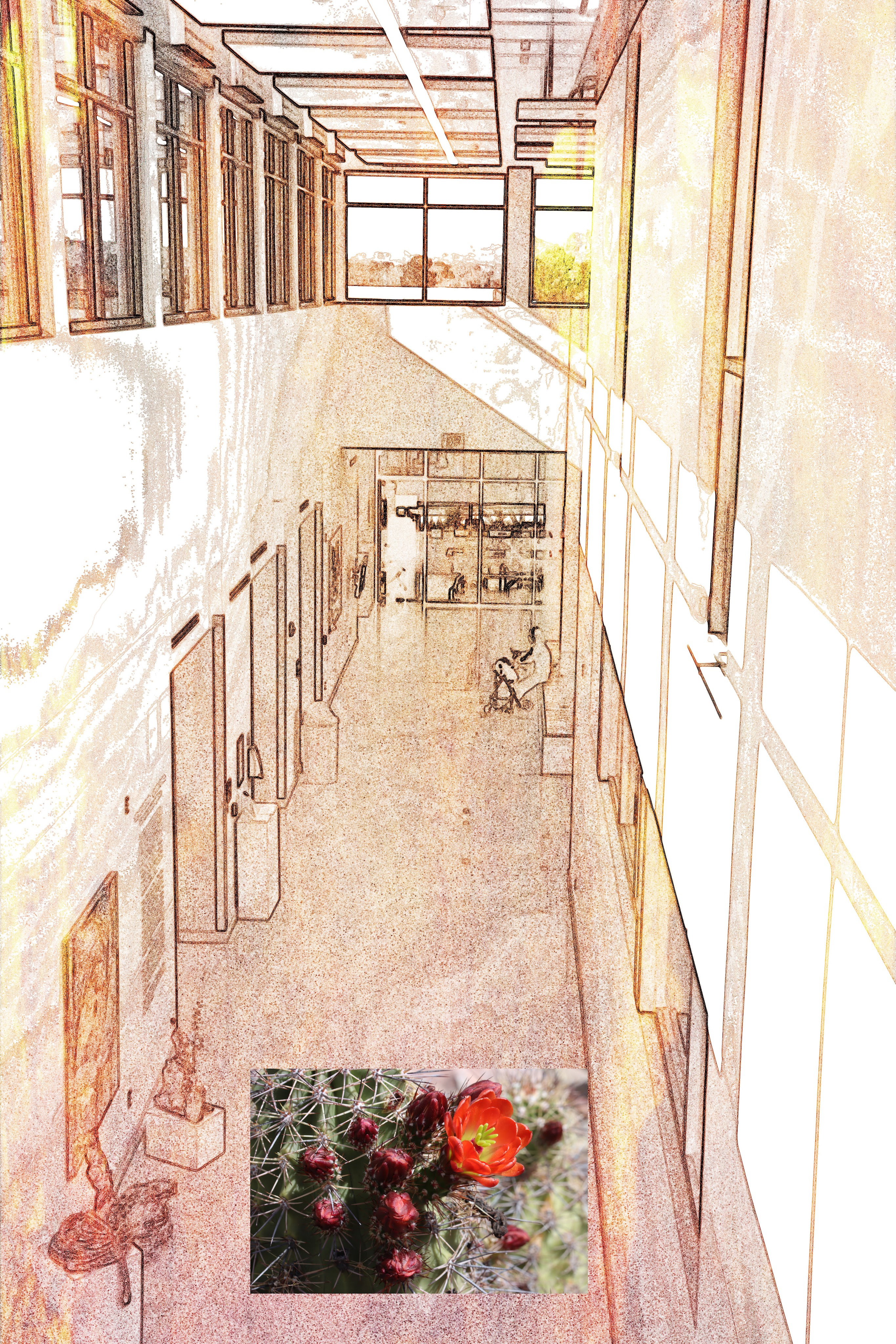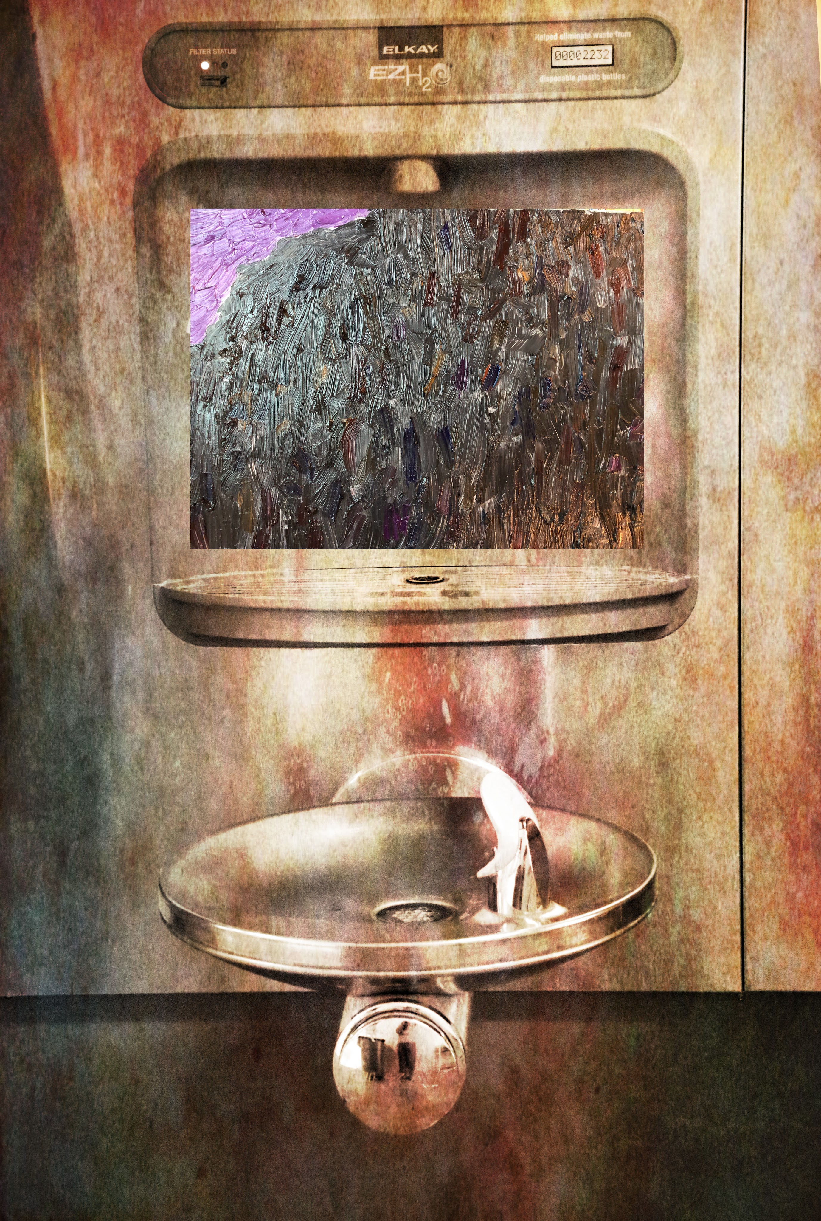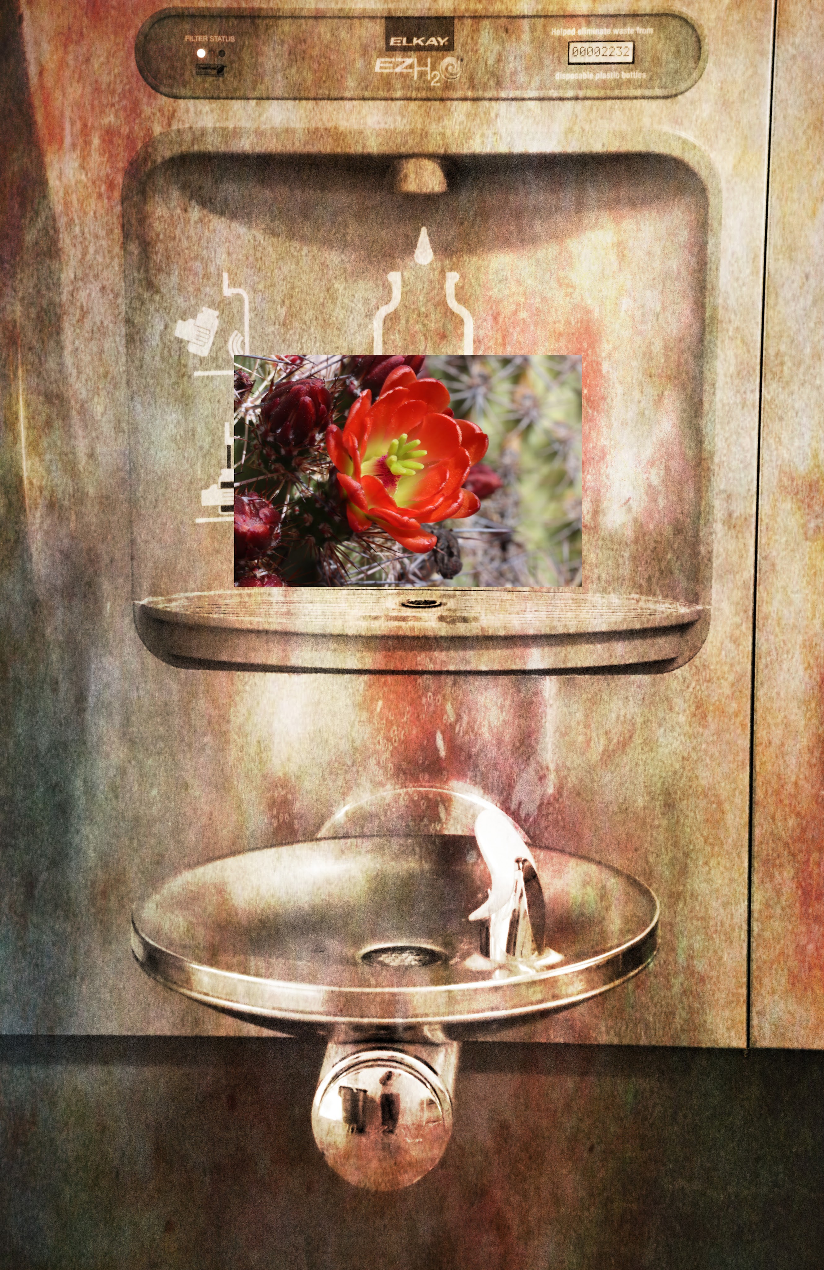 Artistic commentary on drought in the desert. I had to put an overlay onto the drinking fountain photo in order for the cactus to have any color.