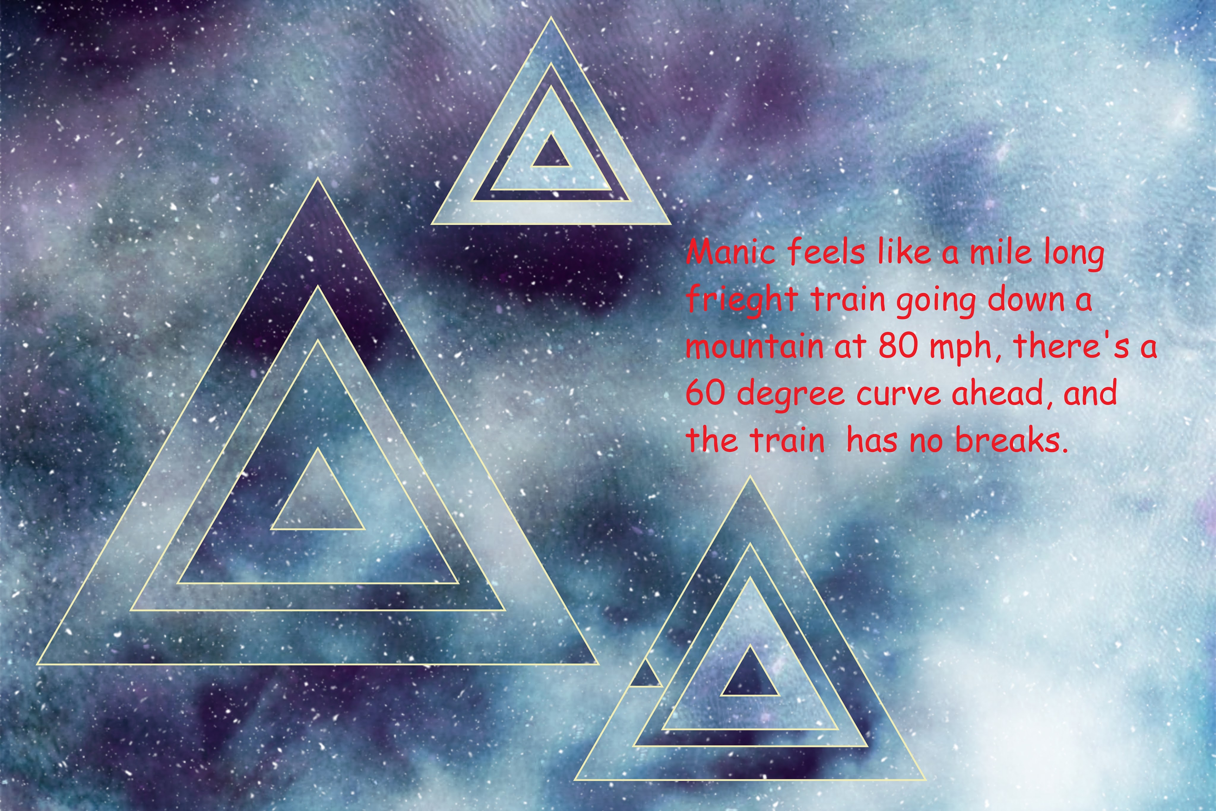 For years, I’ve wanted to do an art piece that shows what bipolar disorder feels like. So far, I’ve been unsuccessful. I’ve a final painting assignment for my painting class. We’re supposed to do something that’s post modern. I’ve talked with my teacher and I’m doing something that’s….I’m not sure what it is. I want to show what manic feels like. I want to show what depressed feels like. I want to show what the dreaded mixed episode – simultaneously manic and depressed – feels like. I want to show the thoughts that inhabit those episodes.