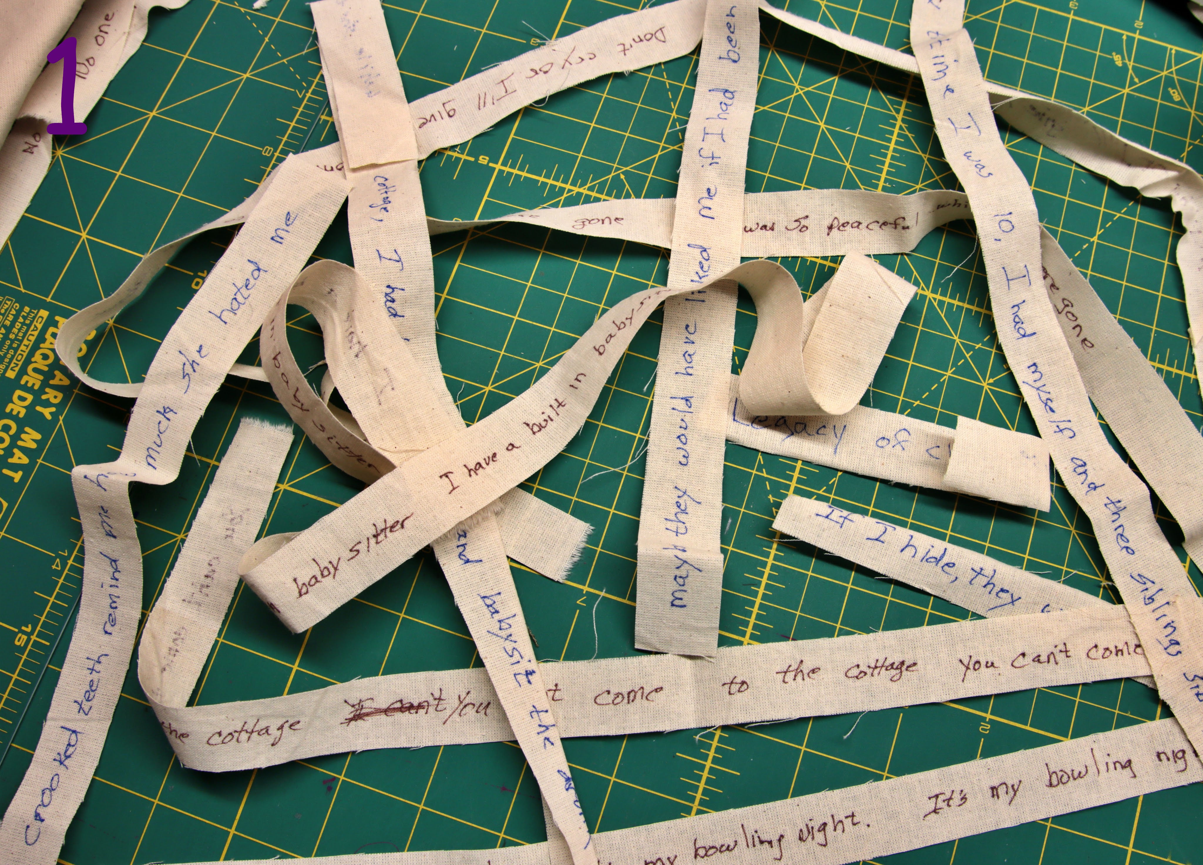 The photo marked #1 is where the idea for the painting started. Using a brown sharpie, I wrote some of the crap my mother said to me. Using a blue sharpie, I wrote how I deal with that crap. I thought about braiding the strips. Then I thought about sewing the strips onto fabric. I’m not sure what I will do with the strips.