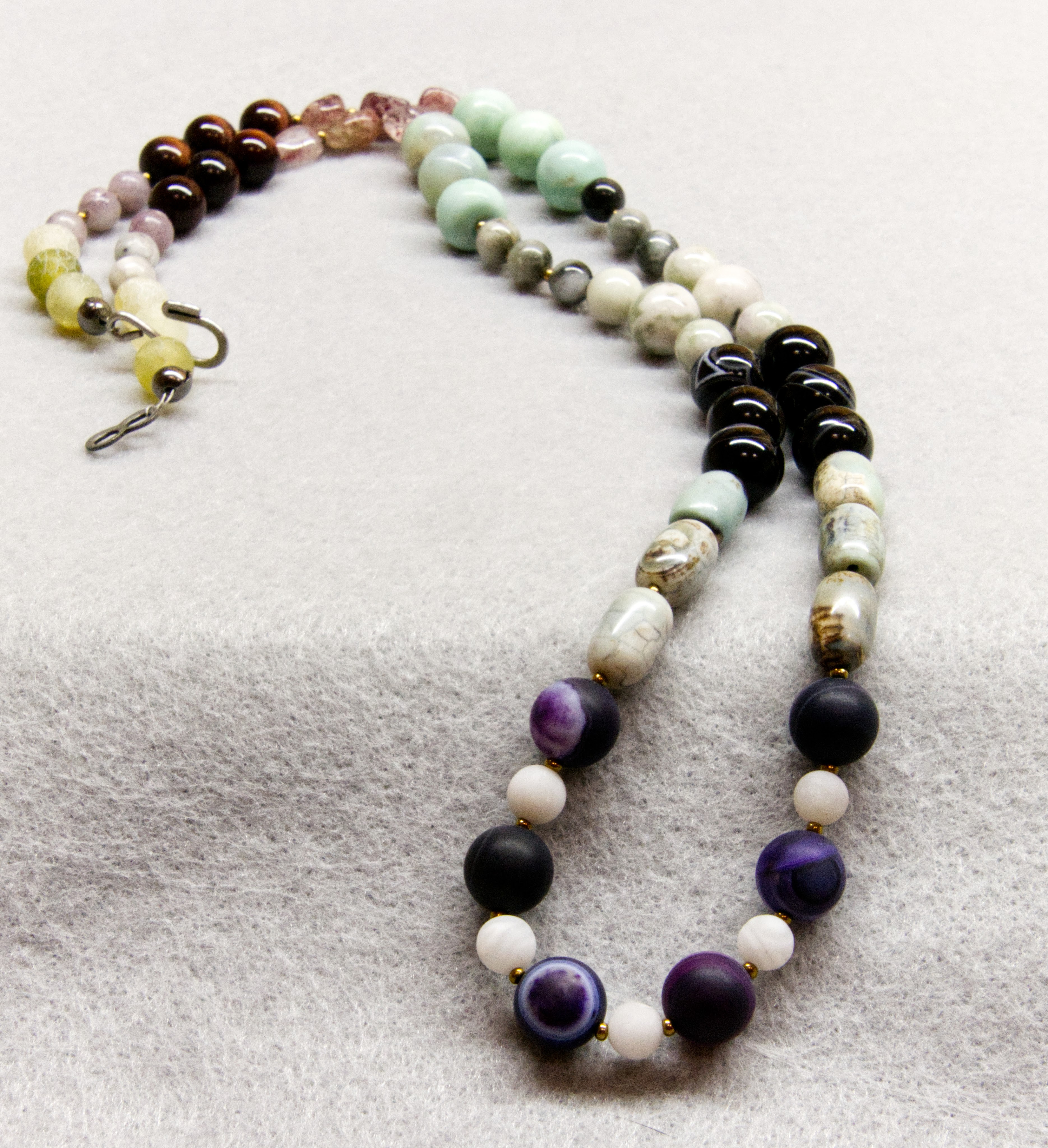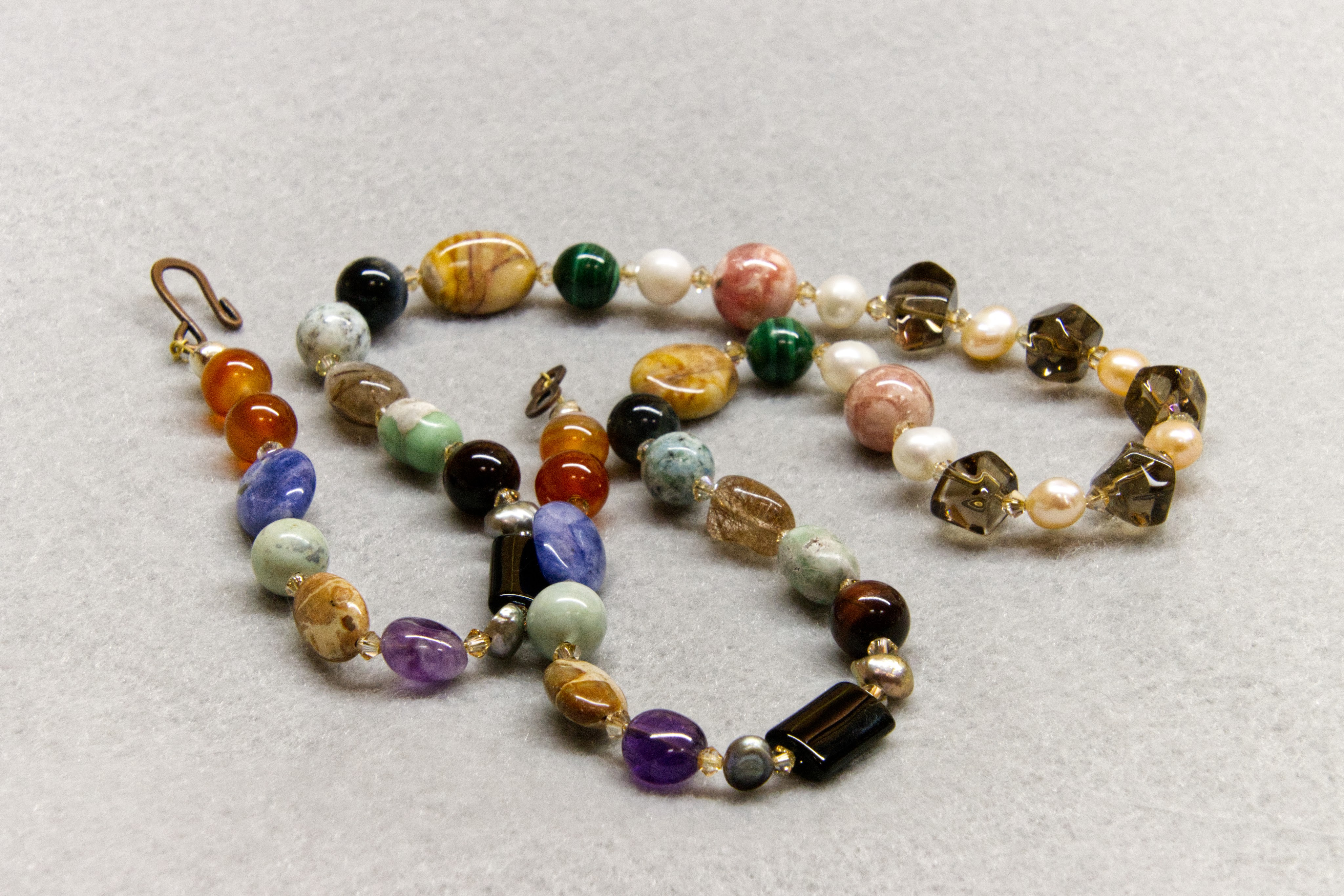 I don’t often make jewelry for myself. I gathered all my favorite gems – smokey quartz, malachite, rhodochrosite, pearls among others and made a necklace for myself.