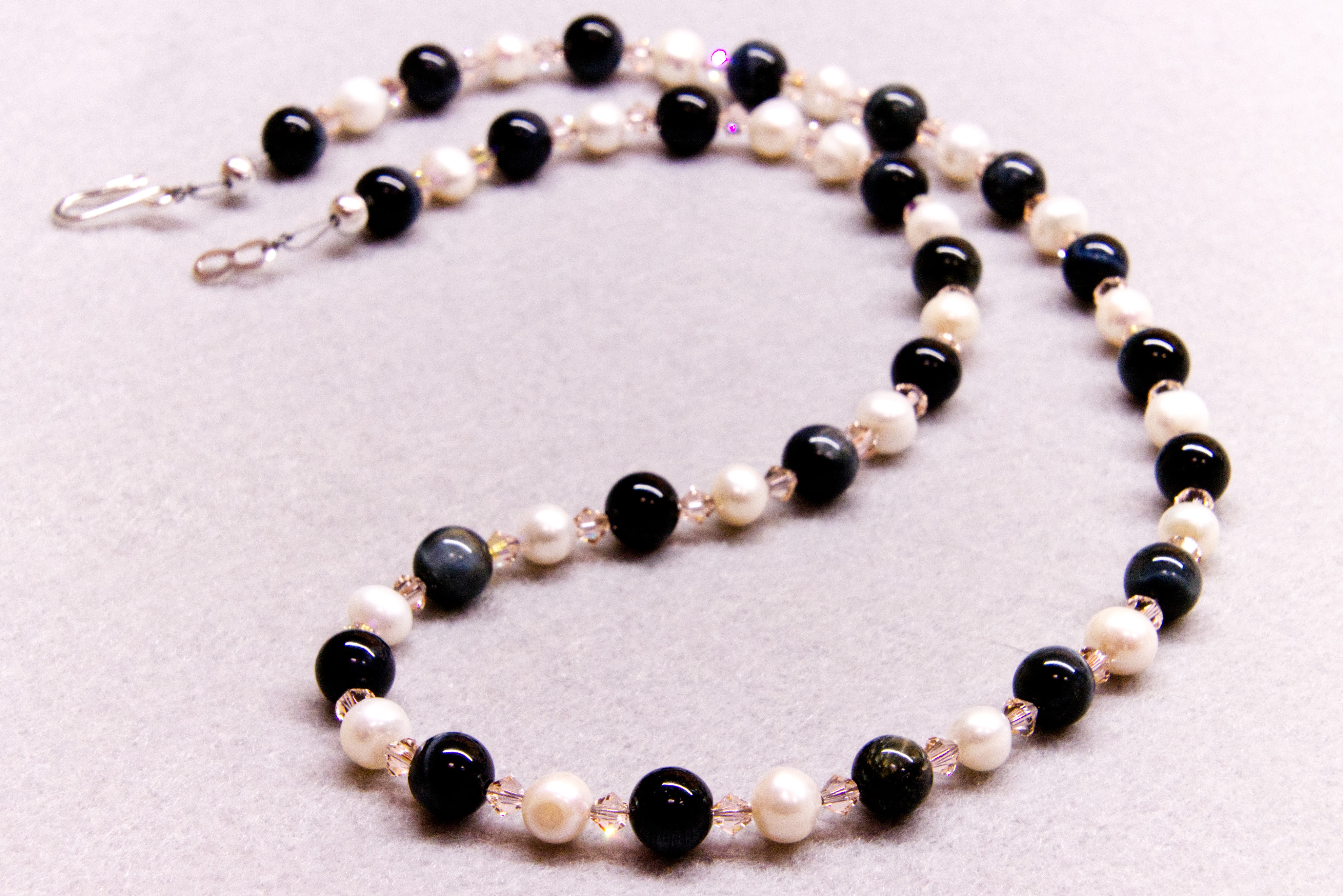 Deep blue tiger eye, creamy pearls and Swarovski crystals. Swarovski is no longer making crystal beads. I do have a stash of Swarovski crystals, but once they are gone, I can’t get any more.