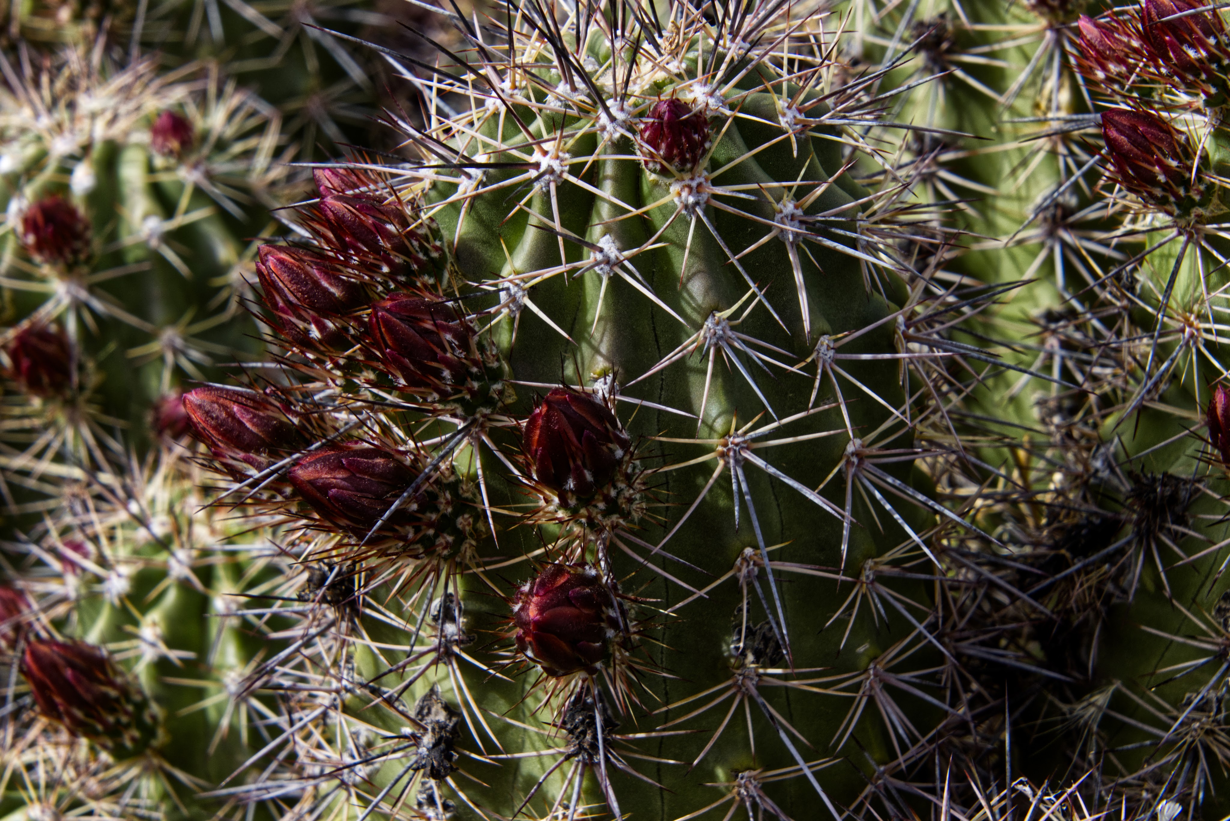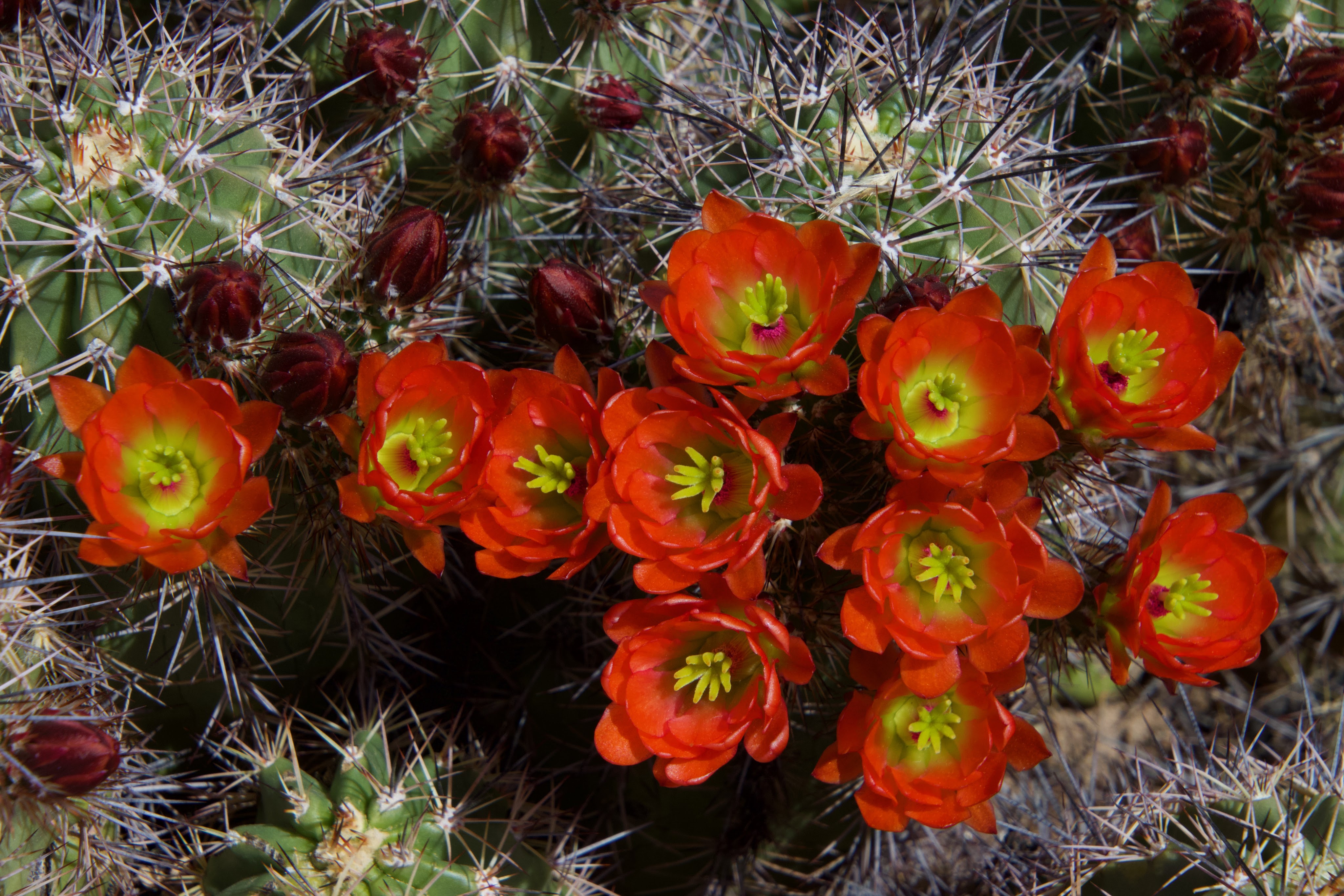 One of the claret cup cactus clumps is blooming. We have several clumps, and each one blooms at a different time. The clump that is blooming now always blooms first and always has the most blooms.