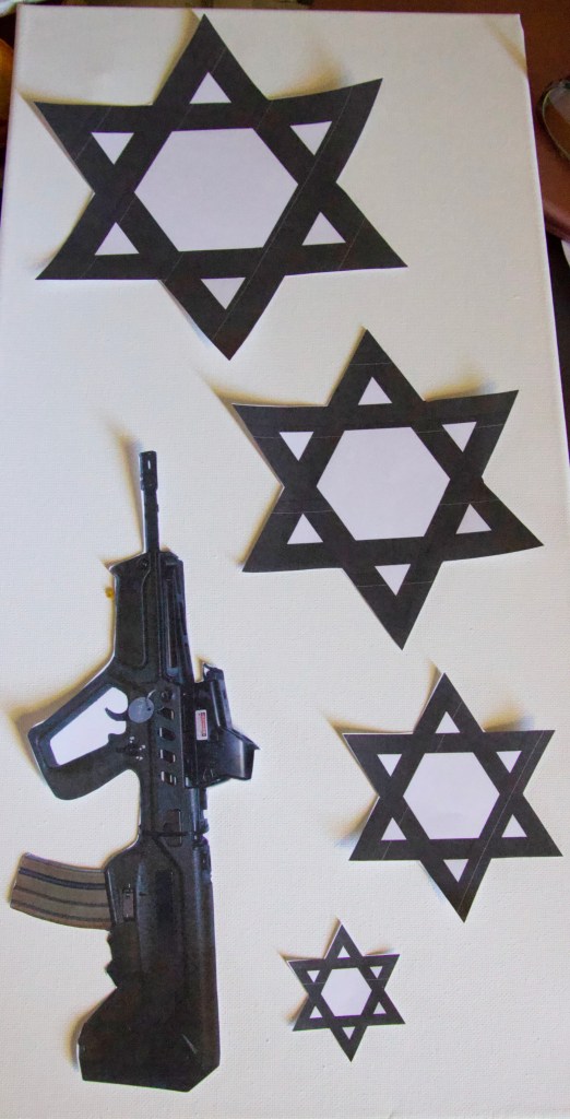 This is one of two paintings that could set off a ****storm and that’s why I’m having extreme anxiety. The painting honors the Israeli soldiers, men, women, and children kidnapped and/or killed by Hamas. It’s actually a study for a fiber piece I want to do.