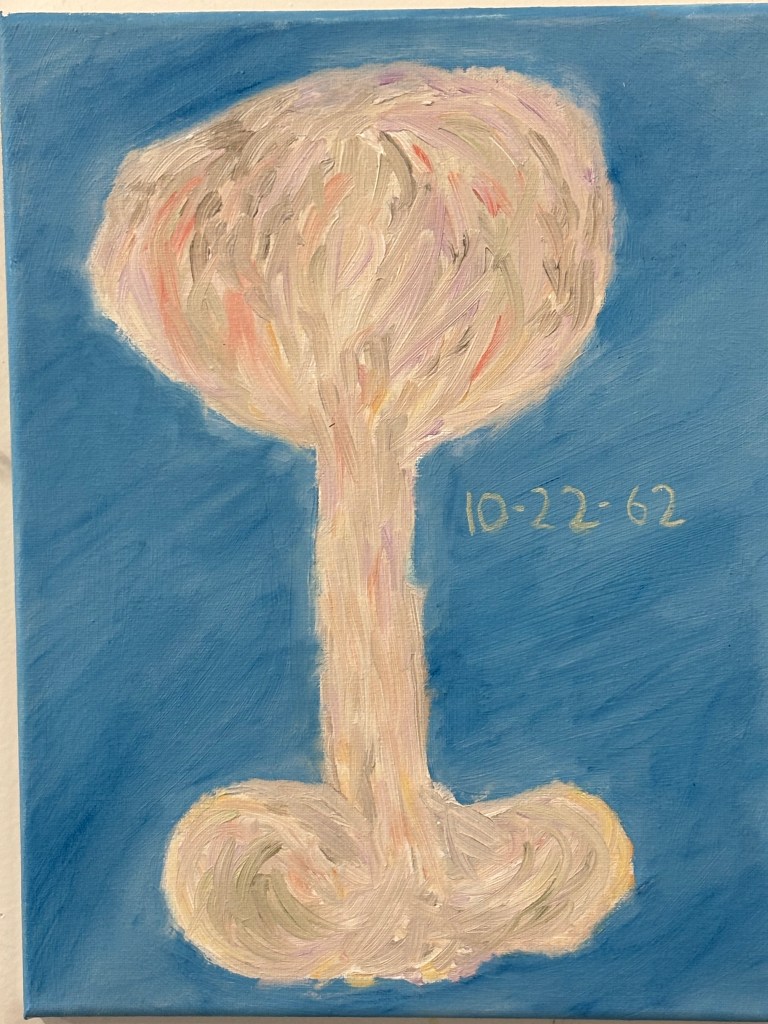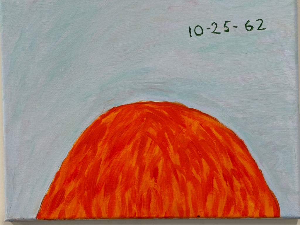 Mine was the first generation to grow up with The Bomb. These two commemorate the Cuban Missile Crisis. 10-22 was the day JFK announced there were missiles in Cuba and they were put there by the Soviet Union. 10-25 was the day the international pissing contest ended with the Soviet Union retreating and pulling their missiles out of Cuba. The top painting is the fireball that happens immediately after a nuclear explosion. The bottom painting is the radioactive cloud that follows the fireball.