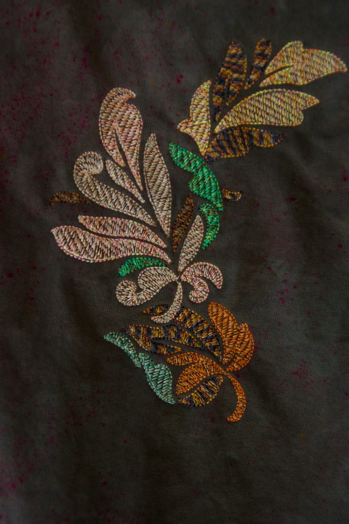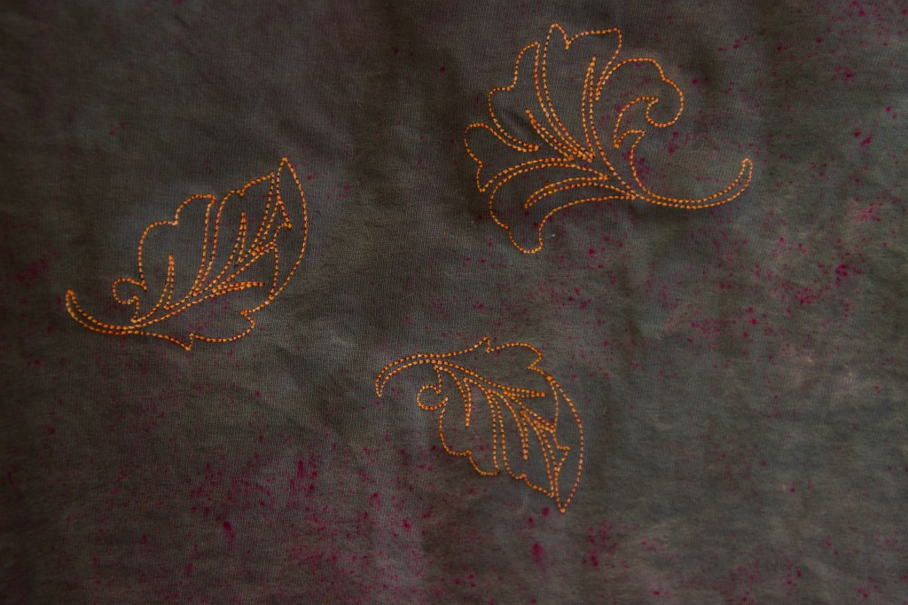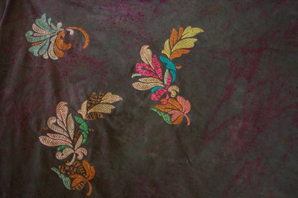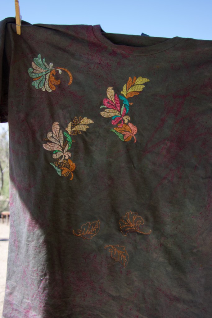 I had some dye failures. One resulted in a brown tee shirt with more freckles than a room filled with red haired kindergarten kids. Jim suggested I consider it a tee shirt to wear while working out at the gym. Okay, but it needs embroidery. Everything I own needs embroidery these days. And so I got out some of my new embroidery patterns and played around.