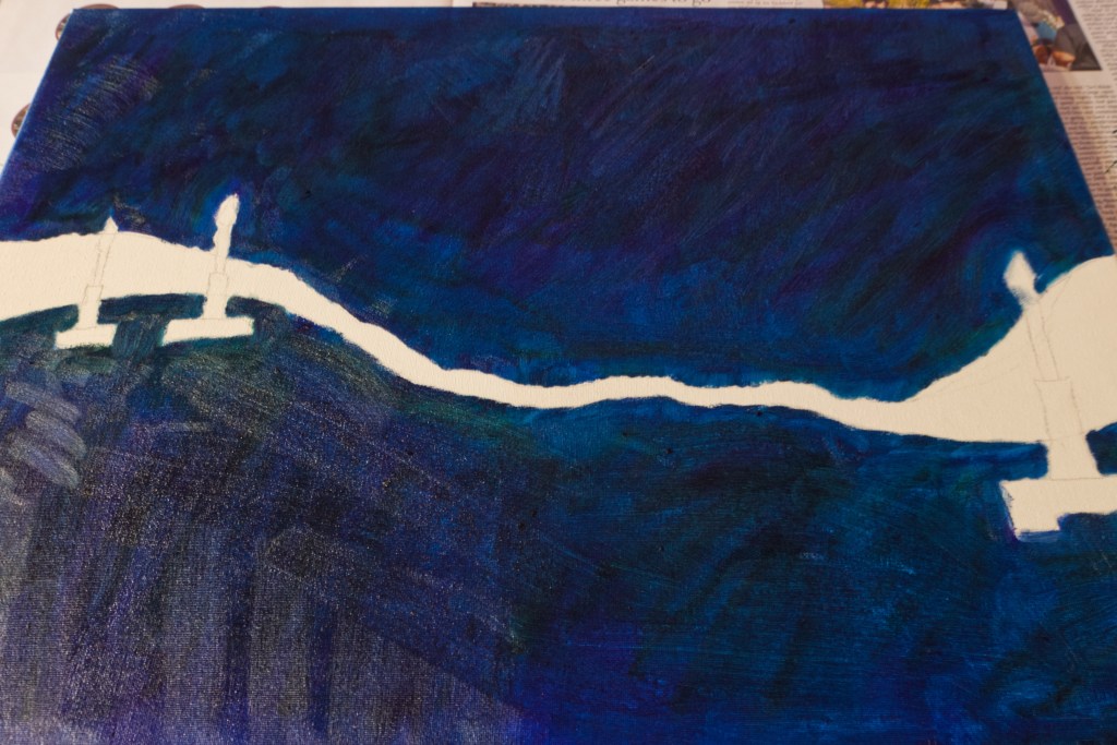 Here’s what I’ve done so far. I can see I need to clean up some brush strokes. I was working with thalo green, thalo blue and ultramarine blue.