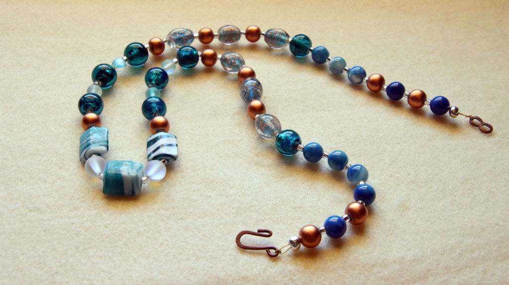The best way for me to stay calm is to make art. I have lots, and lots, and lots, of beads. And now I have seven new necklaces. I haven’t decided if they will go in my store or if I’ll take them to the farmers and craft market to sell. I also haven’t figured out a price for each necklace. Prices are based on time, cost of materials, multiplied by the number of times I have to swear at the beads and adding the square of the number of times I have to go on a search and recovery mission to retrieve the beads I dropped on the floor.