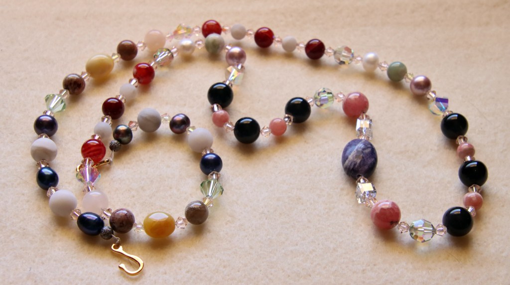 I don’t often make jewelry for myself. I gathered all my favorite gems – smokey quartz, malachite, rhodochrosite, pearls among others and made a necklace for myself.
