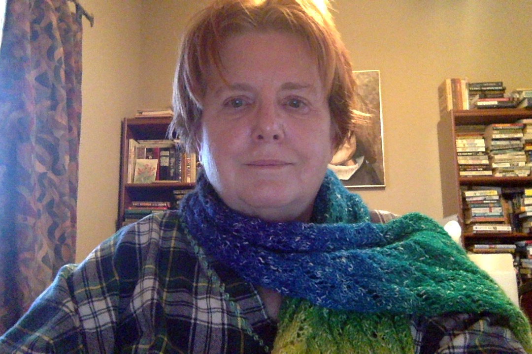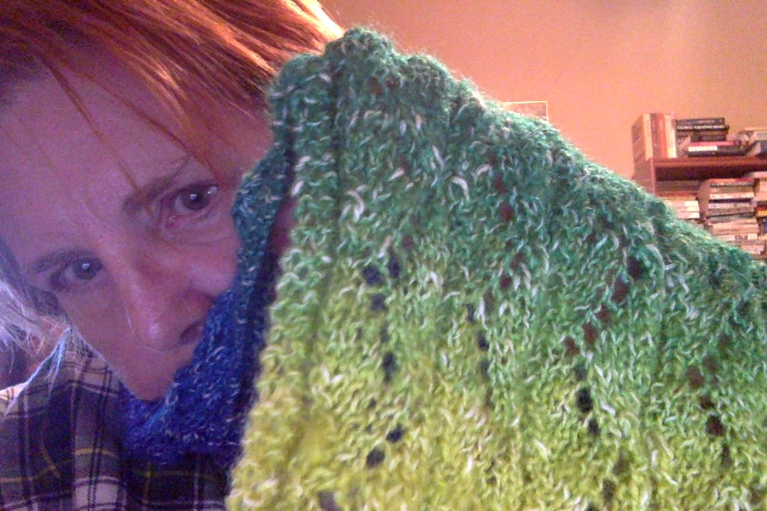 I’m finally able to stand long enough to block and photograph scarves. Being confined to the couch is conducive to knitting. I’m now playing with cotton yarn that I hand dyed. First, I knit some of the yarn. Then I dye the yarn. Then I unravel the yarn and get a mottled effect. I think there’s more life in yarn that isn’t a solid dye.