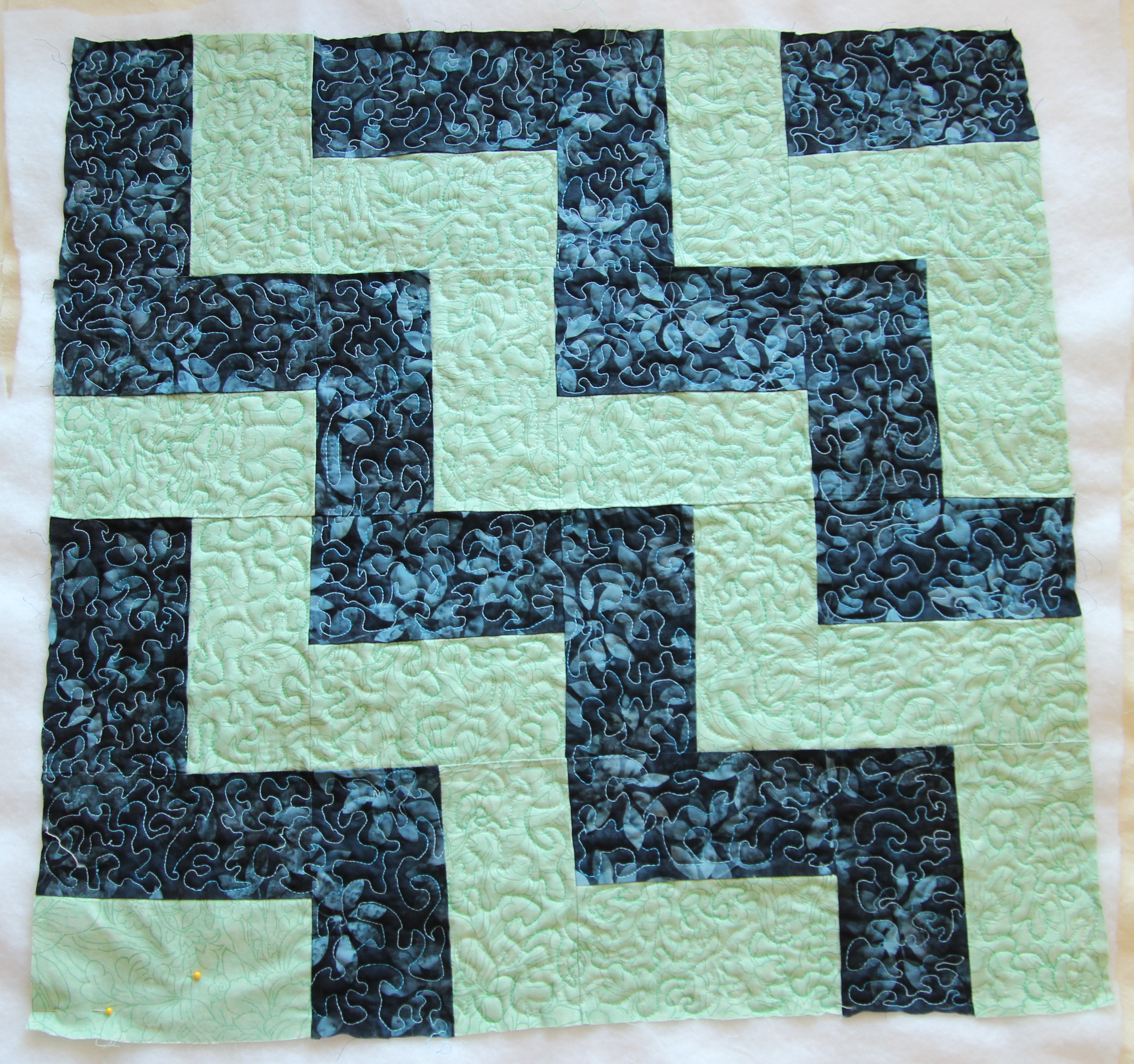 I don’t recall using more than one color thread for any quilted piece before. Not finding one color thread that worked, I used a different color on each part of each piece. That was feasible for the churn dash and fence rail designs. That’s not an option on the variant of log cabin cover. Never having been much good at free motion quilting, I will use the log cabin variant to work out at least one new to me design.