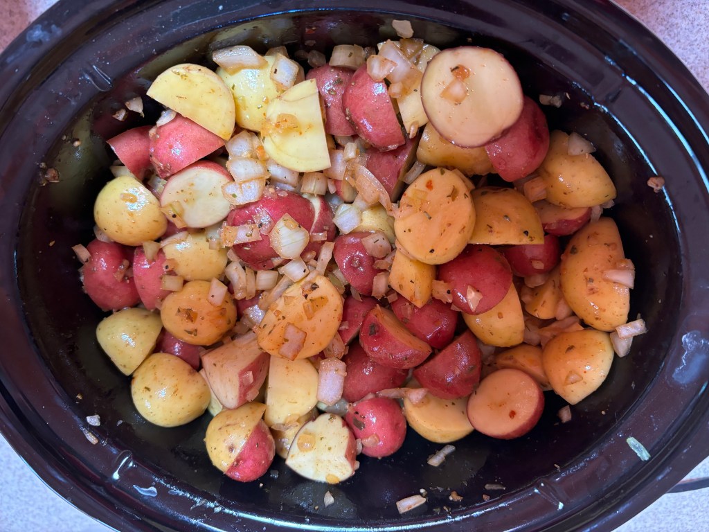 Mix the potatoes, onions, garlic, and seasonings. Then, add just enough olive oil to coat the potatoes. Put it all in the slow cooker on low, and forget about it until it’s time to eat. Figure at least 3 hours to cook. Specific cooking time depends on how much you’re making and your slow cooker. Keep an eye on it, but don’t lift the lid. The point of a slow cooker is moisture stays in the pot rather than condensing on the ceiling.