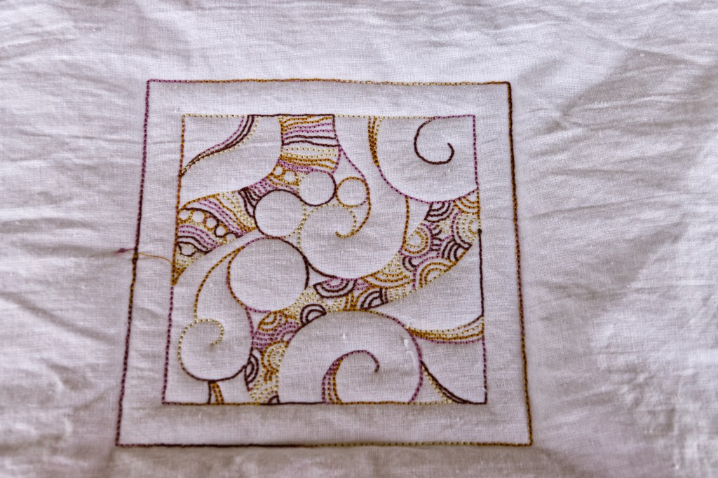 Next, I decided to see what size block the design would fit in. I marked out 12″ 10″ and 9″ squares and experimented. I used leftover muslin from a muslin I made for a dress pattern. Good thing I made the muslin because the size I thought would fit was waaaaaaay too big. Not wanting to waste fabric, I’ve used hunks of that muslin for all sorts of experiments.
